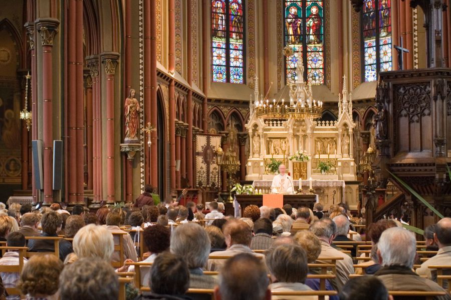 Holy Mass is celebrated in Dutch and English. Weekdays (Mon–Fri) the Mass in Dutch is celebrated at 12:15 PM and 7:30 PM; confession is available 30 minutes before and after each Mass.